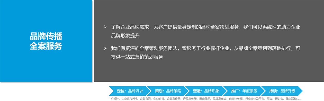 從(cóng)品牌方案的(de)策劃、創意、設計(jì)到(dào)落地(dì)執行(xíng),我們可(kě)以提供一(yī)站(↓zhàn)式全鏈路(lù)服務
